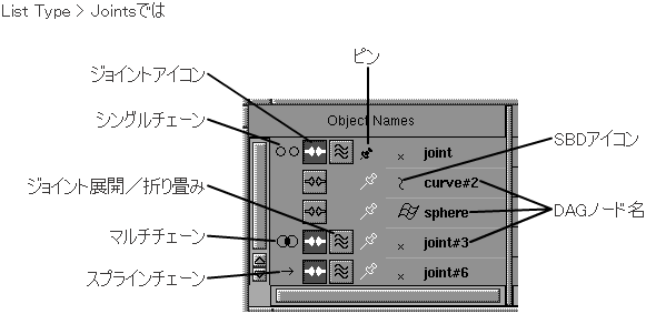 これらのモードでは、リスタにあるジョイント ボタンをクリックすれば、リスタに表示されているどのような DAG ノードでも結果を確認しながらジョイントに切り替えることができます。どの DAG ノードをリスタに表示するか決めるために、自動的に選択された DAG ノードのルート DAG ノードが検索され、そのルート DAG ノードの下位にある DAG ノードがすべてリストアップされます。