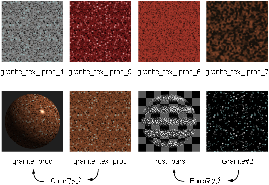 Granite テクスチャは、媒体中に浮遊する 3 種類の球体をランダムに 3 次元空間上に配置して、花崗岩をシミュレートします。Granite テクスチャは、1 つではなく 3 つのセルカラーを持つ Leather テクスチャのようなものです。