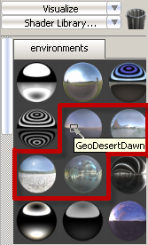 Visualize Control Panel の Shader Library には、ジオメトリ テクスチャを含む GeoDesertDawn、GeoDocks、GeoGypsumCrater、GeoNightPlaza という 4 つの環境が含まれます。