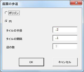 このコードは、ユーザがタイルの形状としてポリゴンを選択し、ポリゴンの有効な辺数を指定したかどうかをテストします。テキスト ボックスに入力された半径と間隔の値は変数 trad と tspac に保存されます。条件文も、trad と tspac の値が 0 (ゼロ)でないことを確認するために使用されます。