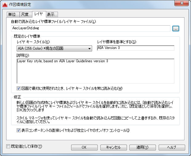 [作図環境設定]ダイアログ ボックスのレイヤ設定。レイヤ キー スタイルは自動読み込みに設定され、[既定値として保存]がオンになることに注意してください。これにより、テンプレートなしで図面を開始した場合でも、確実に正しいレイヤ キー スタイルが読み込まれます。[図面で最初に使用されたとき、レイヤ キー スタイルを常に読み込む]がオンになっていることにも注意してください。これは図面ベースの設定で、テンプレートに設定する必要があります。これにより、最新のレイヤ キー スタイルが、すでに進行中の図面でも使用されます。
