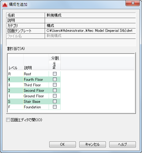 5. この構成をただちに使用する場合は、図面エディタで[開く]を選択します。