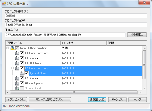 外部参照を IFC ファイル内で異なるレベルとして表示する必要がある場合は、[IFC 構造]で別の識別ラベルを指定します。レベル(1)などの同じ識別子を複数の外部参照に対して指定し、これらの外部参照内のオブジェクトを 1 つの IfcBuildingStorey に結合することができます。