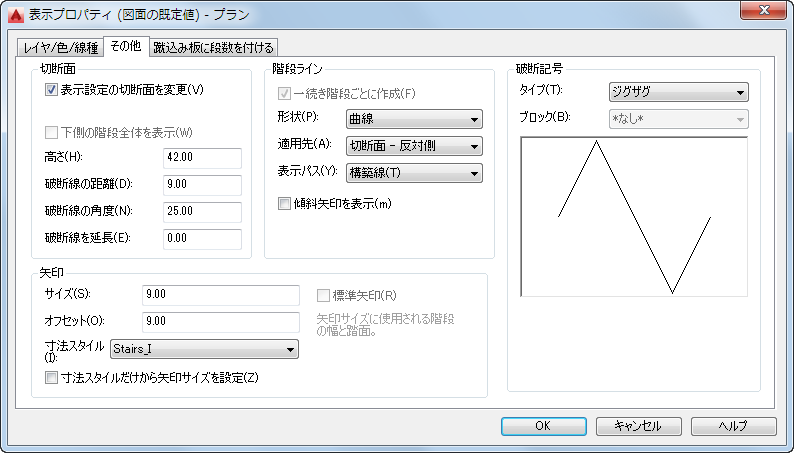 8. [破断線の角度]に値を入力し 階段の破断線の角度を指定します。