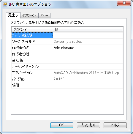 [IFC 書き出しのオプション]ダイアログ ボックスの[見出し]タブに、画面上でアクティブな図面の名前が表示されます。図面の説明、作成者と会社名、許可データ、および建物の地理的位置などの、書き出す図面ファイルに関する情報を追加できます。たとえば、構造図の説明を、[見出し]タブに Structure for Commercial Building 152 と入力することができます。この情報は、IFC ファイルを表示した際に、そのファイルのヘッダに表示されます。