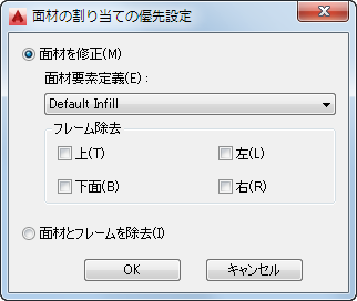 面材の周囲のフレームを 1 つまたは複数除去するには | 除去するフレーム コンポーネントを選択します。たとえば、セルを変更して、パネル面材の代わりにドア面材を割り当てることができます。この場合、セルの下フレームを除去することをお勧めします。 |