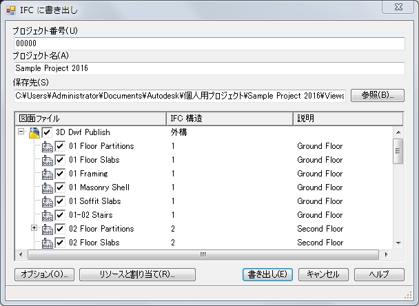 プロジェクト ファイルから書き出す外部参照と、その IFC ファイル内での表示方法は、既定のレベル割り当てを受け入れるか、または別のラベルを指定することによってユーザが決定します。同じ IFC 構造に割り当てられるすべての図面は、IFC ファイルの IfcBuildingStorey に書き出されます。