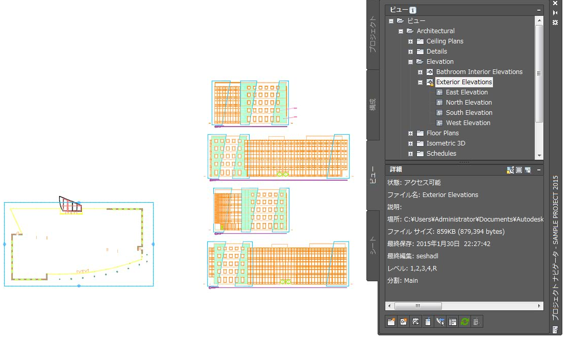 建築プロジェクトの構造を定義し、構成をレベルや分割に割り当てた後で、ビュー図面の作成を開始できます。ビュー図面では、建築プロジェクトの特定のビューを表示するために、いくつかの構成を参照します。ビュー図面を作成するときは、表示する建物の部分および生成するビューのタイプを最初に決定します。たとえば、1 階の天井伏せや 2 階のフレーム プランを作成したり、建物の全床の複合的なビューを作成します。ビュ-図形では、建物内のレベルと分割の割り当てに対応する構成が自動的に参照されます。たとえば、2 階西ウィングの平面図を作成する場合、2 階および西ウィングに割り当てられた構成すべてを参照するビューを作成します。また、1 階から 5 階までのカーテン ウォールも作成します。