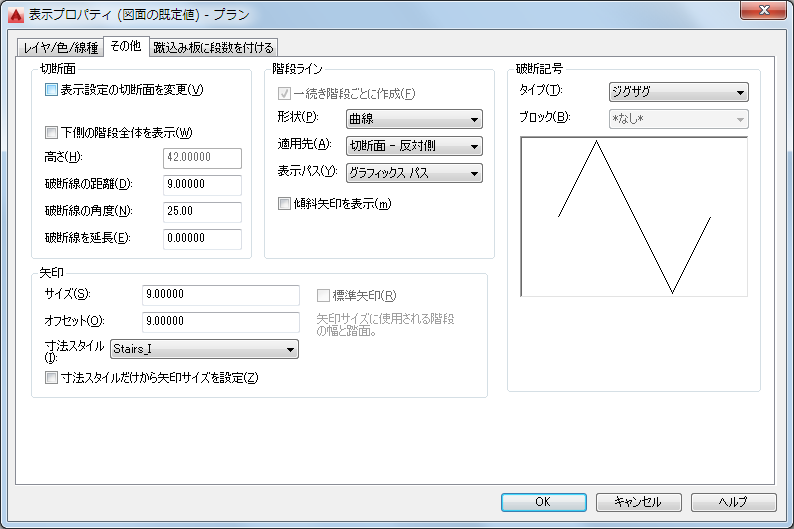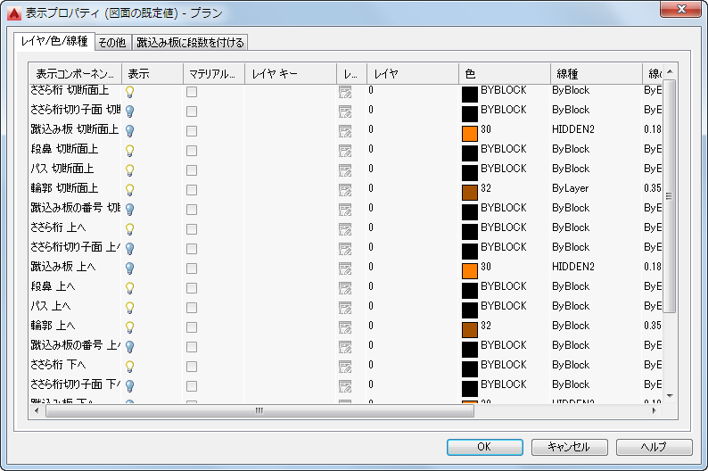 Autodesk Architectural Desktop の 2004 より前のバージョンで作成された階段では、[表示設定の切断面を変更]オプションが既定で選択されています。現在のバージョンでは、このオプションは既定でオフになっており、階段コンポーネントの表示はレベルごとの表示設定によって自動的に処理されます。