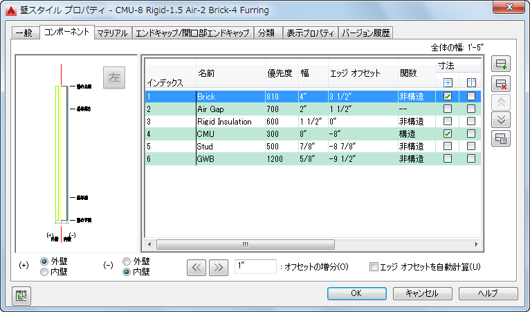 名前自体に壁の構造に関する情報をできるだけ多く与える必要があります。これにより、壁スタイルの説明を参照することなく、長い一覧の中から壁スタイルをより簡単に選別することができます。一覧表示中の最初のコンポーネントは、主な構造コンポーネントです。一覧表示中の最後のコンポーネントは、通常は仕上げコンポーネントです。