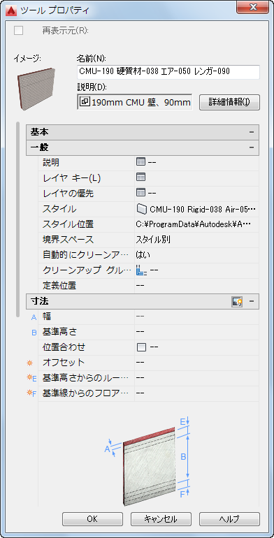 パレットベースのツールに割り当てることができる壁ベースのスタイルは、壁スタイル自体のみです。ただし、壁スタイルが使用されるとき、壁エンドキャップ スタイルや壁の開口部エンドキャップ スタイルなど、壁スタイルで使用するサブスタイルは、壁スタイルとともに自動的に読み込まれます。さらに、ツールをカタログに保存する前に既定値として設定することができるツール プロパティが次のようにいくつかあります。