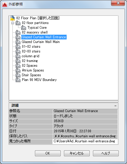 - [見つかった場所]には、外部参照が発見されたパスが表示されます。外部参照のパスが保存されていない場合、または指定されているパスに外部参照が存在しなくなっている場合には、プログラムによって外部参照が検索され、その場所が[見つかった場所]に表示されます。