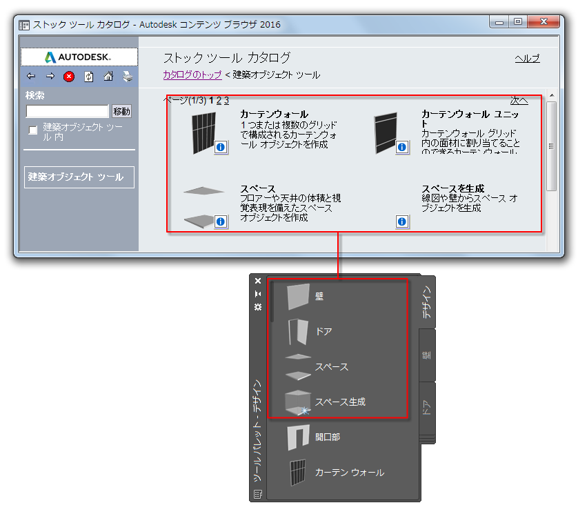 [コンテンツ ブラウザ]内のカタログのツールを AutoCAD Architecture 内のツール パレットにリンクするには、次の手順を実行します。