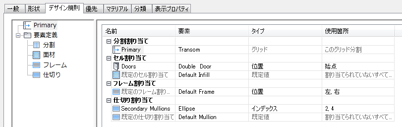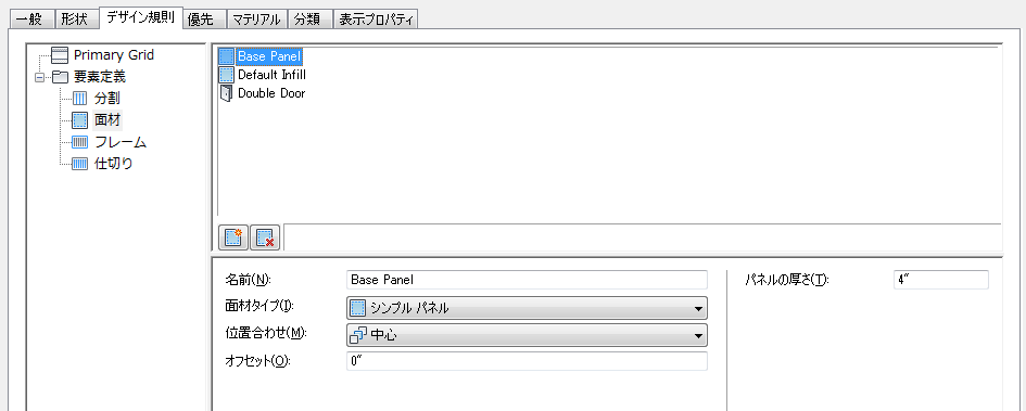 定義名の変更を含むすべての変更は、既存の定義に上書きされます。割り当て一覧から新しい定義を作成するには、[要素]リストから[新規作成]を選択します。定義一覧から新しい定義を作成するには、[分割を新規作成]アイコン、[面材を新規作成]アイコン、[フレームを新規作成]アイコン、または[マリオンを新規作成]アイコンをクリックします。