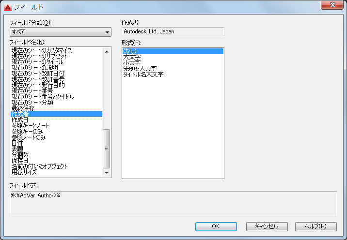 日付/時刻、ドキュメント、ハイパーリンク、オブジェクト、システム変数、Diesel 式、または印刷フィールド AutoCAD ヘルプの「文字内でフィールドを使用する」を参照してください。