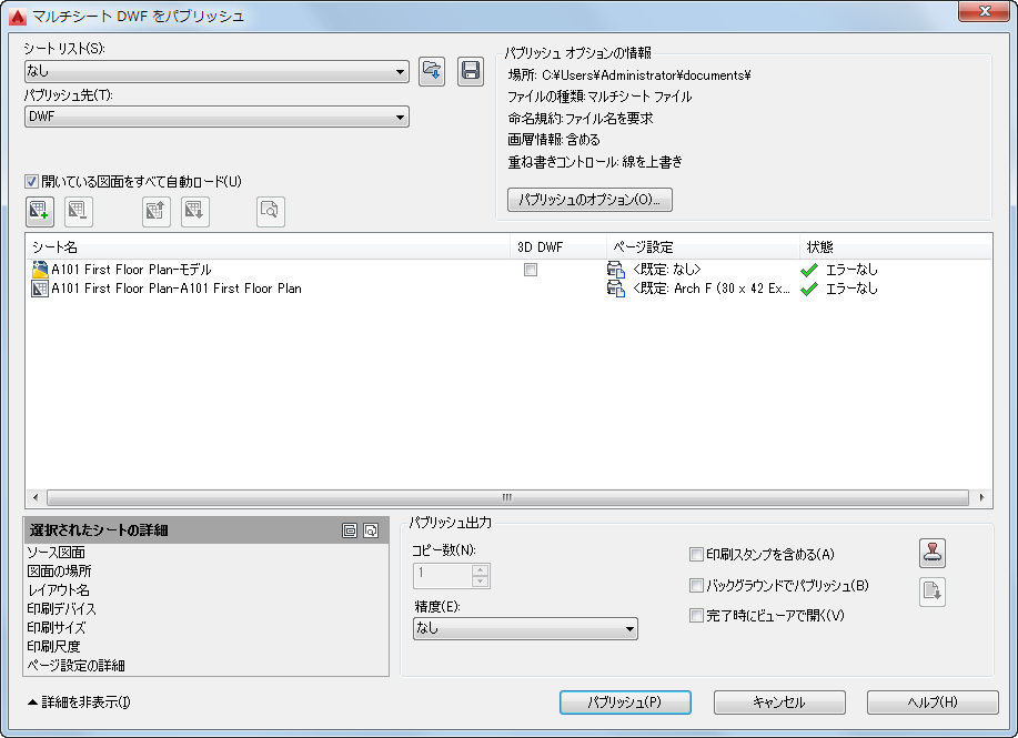 - [マルチシート DWF をパブリッシュ]ダイアログ ボックスで、[パブリッシュ]を選択します。