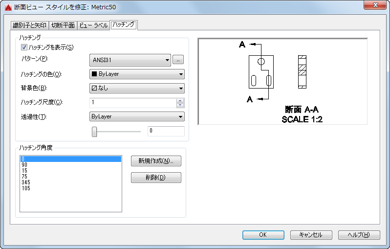 - 断面ビュー内のすべてのハッチングに使用するハッチング パターンを設定します。