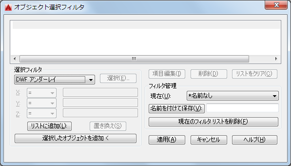 現在の[選択フィルタ]のプロパティをフィルタ リストに追加します。名前のないフィルタに追加したフィルタ プロパティは、手動で削除しない限り、現在の作業セッション中に使用できます。
