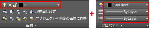 リボンの[ホーム]タブで、頻繁にアクセスするプロパティである画層、色、線の太さ、線種の設定を確認または変更するには、[画層]および[プロパティ]パネルを使用します。