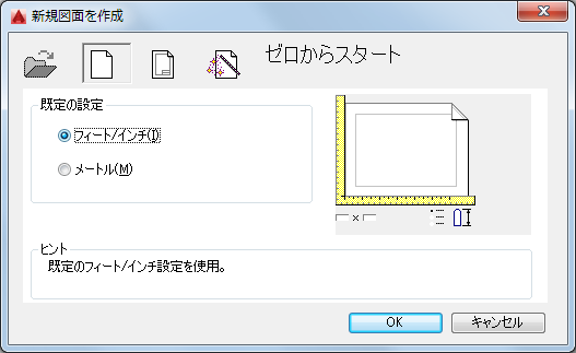 [ゼロからスタート]は、既定のフィート/インチ設定またはメートル設定を使用して、新しい図面を作成します。[テンプレートを使用]は、選択した図面テンプレートで定義されている設定を使用して新しい図面を作成します。[ウィザードを使用]は、[クイック セットアップ]ウィザードまたは[高度なセットアップ]ウィザードで指定した設定を使用して新しい図面を作成します。(最初の[図面を開く]オプションは、NEW[新規作成]コマンドからは実行できません。 既存の図面を開くには、OPEN[開く]コマンドを使用します)。