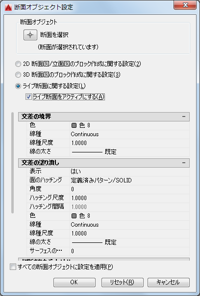 ライブ断面をオンにしたときの図面での断面オブジェクトの表示方法を決定します。
