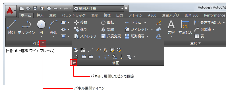 リボン タブからパネルを引き離し、作図領域や他のモニタに置くことができます。浮動パネルは、リボン タブを切り替えても、リボンに戻さない限り開いたままになります。