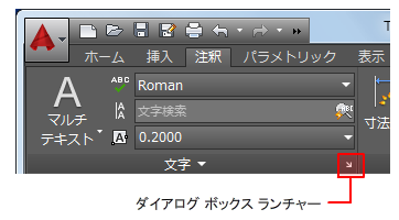 いくつかのリボン パネルからは、そのパネルに関連するダイアログ ボックスを表示できます。関連するダイアログ ボックスを表示するには、パネルの右下コーナーの矢印アイコン によって表されているダイアログ ボックス ランチャーをクリックします。
