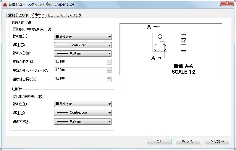 断面線のエンド ラインセグメントとベンド ライン セグメントのプロパティをコントロールします。