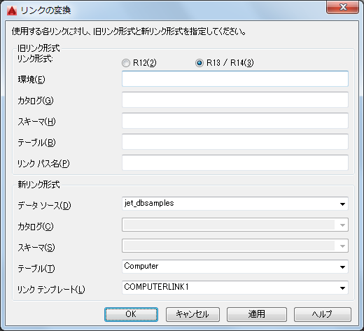 変換するリンクの形式を指定します。[R12]と[R13/R14]のどちらを選択するかによって、異なるフィールドが表示されます。