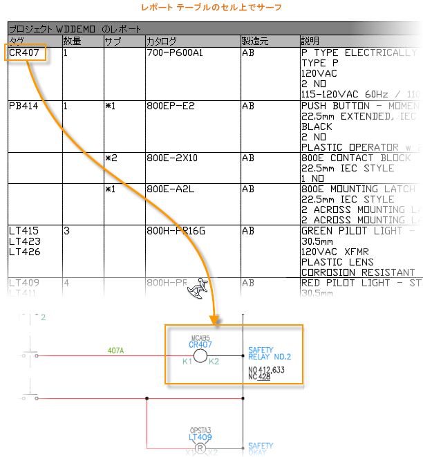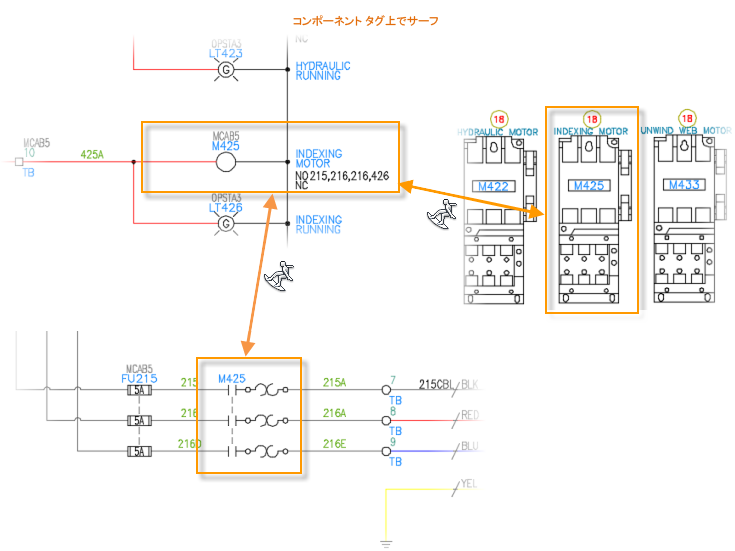 AutoCAD Electrical では、親コンポーネントの 3 種類のクロスリファレンスの注釈がサポートされています。