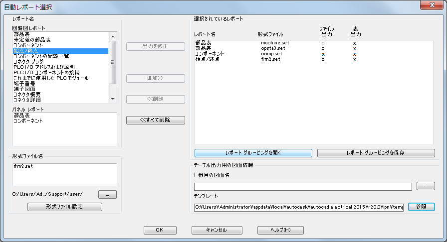 [自動レポート]では、レポートのグループおよび各レポートの形式ファイルを選択します。レポートは画面に表示されません。形式ファイルごとに、レポートをファイルに出力するか、表として挿入するか、その両方を実行する必要があります。新規図面が新しい表のプロジェクトに追加されます。