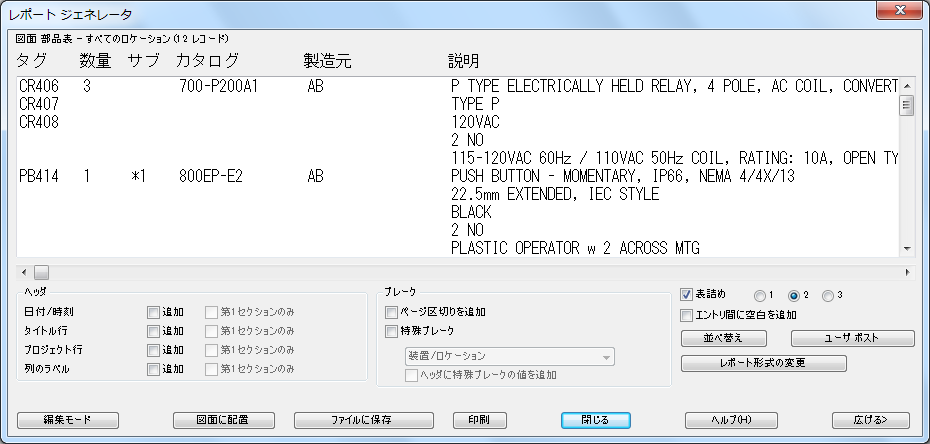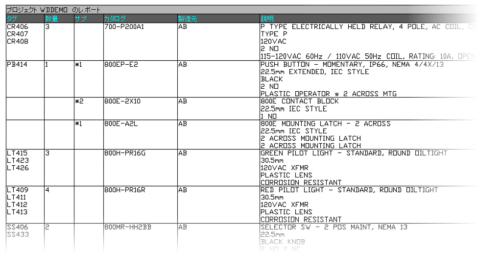 AutoCAD Electrical では、さまざまなレポートを選択することができます。回路図図面のみから抽出された情報で構成されるレポートもあれば、パネル レイアウト図面のみの情報で構成されたレポートもあります。また、パネル レイアウトに表示されないすべてのパネル項目および回路図項目が記述された完全な部品表レポートも作成できます。