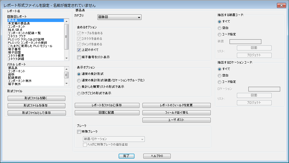 このダイアログ ボックスでは、レポートのオプション、フィールドの設定、レポート表の設定、出力ファイルの設定などをプリセットします。レポートのオプションは、選択したレポート タイプによって異なる場合があります。