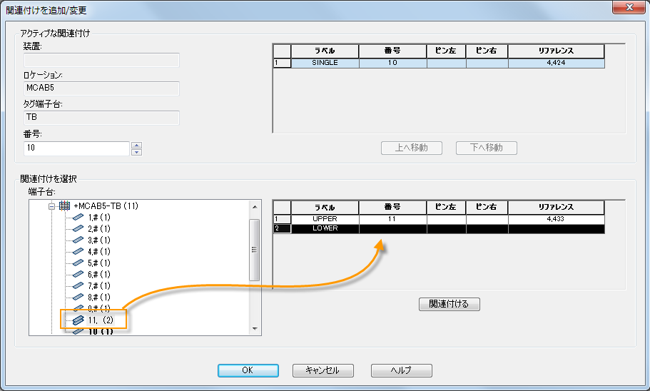 端子が同じ図面にない場合は、別の端子との関連付けに追加する端子を編集します。[追加/変更]ボタンを選択して、[関連付けを追加/変更]ダイアログ ボックスを開きます。このダイアログ ボックスでは、端子を別の端子の開レベルに追加することができます。