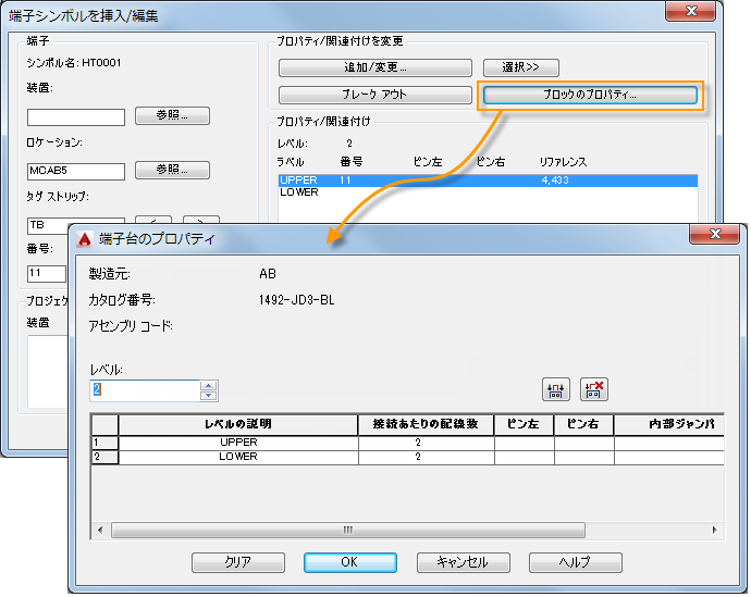 回路図端子シンボルは、単一レベル端子、またはマルチレベル端子の 1 つのレベルを表すことができます。端子のレベル数は端子台プロパティとして定義します。各レベルには、ラベル、接続ごとの配線数、左側ピン、右側ピンなどの特性が保持されます。各回路図端子シンボルには各レベルのブロック プロパティがすべて含まれるため、端子シンボルを 1 つ削除してもブロック プロパティは削除されません。ブロック プロパティを修正すると、すべての端子シンボルが更新されます。レベルのプロパティがないシンボルは、単一レベル端子として処理されます。端子プロパティは、カタログ割り当ての一部として指定し、カタログの割り当て時に自動的に適用することができます。