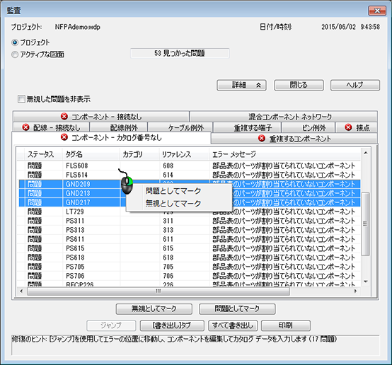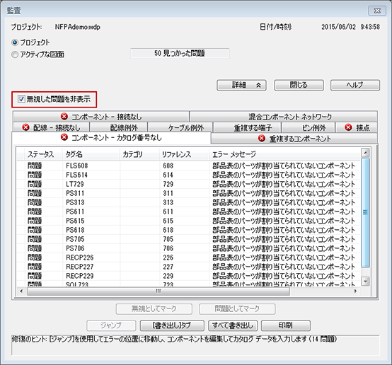 エラーのステータスは、監査を実行するたびに AutoCAD Electrical のセッション間で記憶されます。
