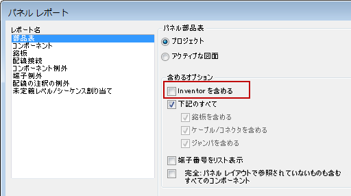 プロジェクトがエレメカ プロジェクトの一部として Inventor アセンブリにリンクしている場合、複合部品表レポートを生成することができます。パネル部品表レポートの生成時に Inventor パーツを含めるオプションを使用できるようになりました。