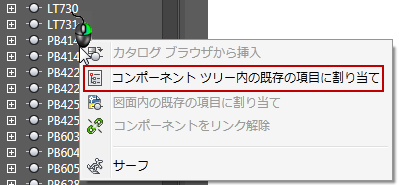 [ロケーション ビュー]タブのツリーで、AutoCAD Electrical コンポーネントまたは Inventor パーツのいずれかを右クリックし、[コンポーネント ツリー内の既存の項目に割り当て]をクリックします。