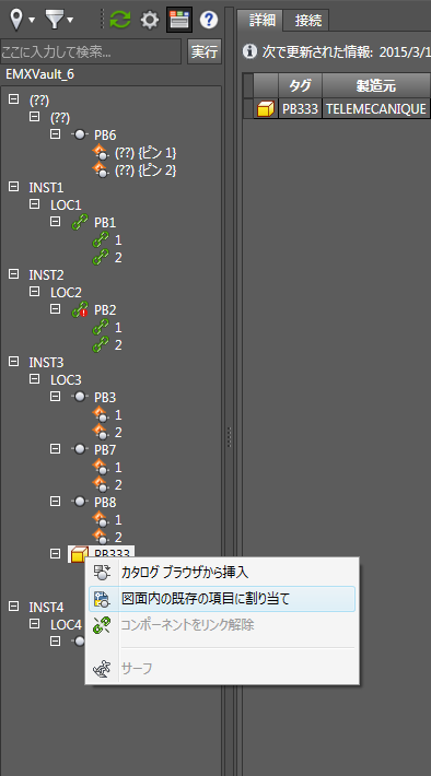 - アクティブな図面で、Inventor パーツに関連付ける Electrical コンポーネントを選択します。リンクしたコンポーネントへのコンポーネント リンクを作成した後、コンポーネントのツリー表示が更新されます。