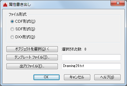 属性データを書き出すファイルの名前と場所を指定します。属性データを書き出すファイルのパスと名前を入力するか、[出力ファイル]ボタンをクリックし、標準のファイル選択ダイアログ ボックスを使用して、既存の出力ファイルを検索します。CDF または SDF ファイルの場合はファイル拡張子は .txt になり、DXF ファイルの場合は .dxx になります。