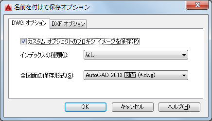 旧バージョンのファイル形式で保存したり、別のアプリケーションで作成されたカスタム オブジェクトが図面に含まれている場合は、[カスタム オブジェクトのプロキシ イメージを保存]チェック ボックスをオンにして、図面ファイル内のカスタム オブジェクトのイメージを保存しす。(システム変数 PROXYGRAPHICS)