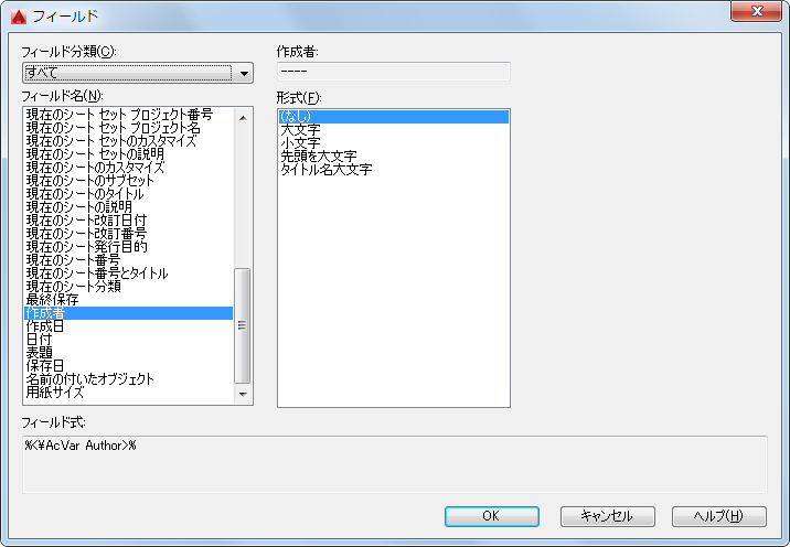 この項目のラベルは、フィールド名によって異なります。たとえば、[フィールド名]リストから[ファイル名]を選択すると、ラベルは「ファイル名」、値は現在の図面ファイルの名前になります。オブジェクト フィールドのラベルは「プロパティ」です。例外: 日付フィールドを選択した場合は、選択した日付の形式(たとえば M/d/yyyy)が表示されます。
