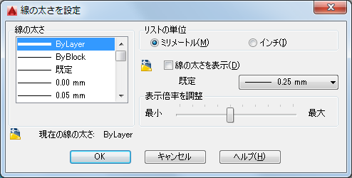 線の太さの値をミリメートルで指定します。(システム変数 LWUNITS)