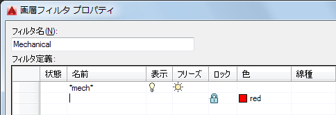 画層名を入力します。標準のワイルドカード文字を使用して画層名の一部分を表すこともできます。たとえば、*mech* と入力すると、名前に mech という文字が含まれるすべての画層が表示されます。