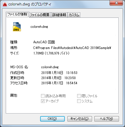 図面ファイルに関する読み込み専用の情報が表示されます。このデータは、オペレーティング システムから取得されます。