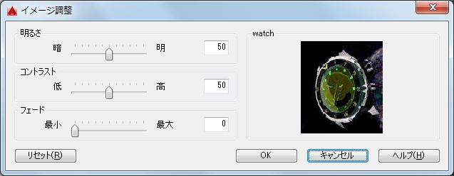 イメージのフェード効果をコントロールします。値が大きいほど、イメージが現在の背景色と混ざる度合いが高くなります。値を 100 にすると、イメージはウィンドウの背景色と完全に溶け込みます。画面の背景色を変更すると、イメージは新しい色にフェードされます。印刷では、フェードの背景色は白です。