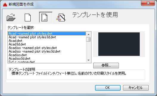 選択したテンプレートの説明が表示されます。独自のテンプレートを作成する場合は、[テンプレート オプション]ダイアログ ボックスを使用して、ここに表示したい文字列を指定することができます。詳細は、SAVEAS[名前を付けて保存]コマンドを参照してください。