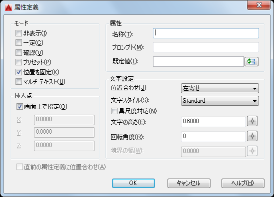属性文字の位置合わせ、文字スタイル、高さ、回転角度を設定します。