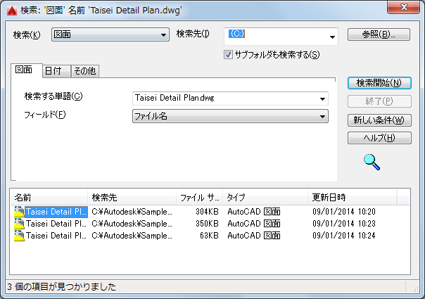 検索する図面、ブロック、画層、外部参照の名前、またはその他のコンテンツの種類を指定します。