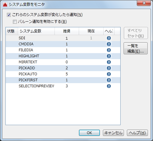 このダイアログ ボックスには、システム変数が一覧表示され、必要に応じて値を表示したり変更することができます。
